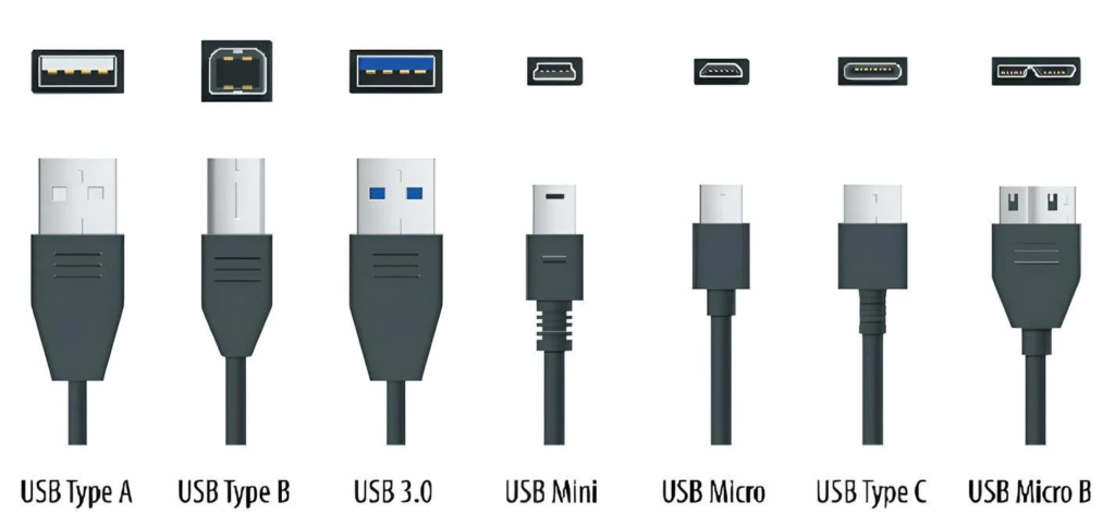 Los conectores A y B vienen en tamaños: USB A/USB B “estándar”, miniUSB A/miniUSB B y micro USB A/micro USB B. Los conectores mini y micro USB A fueron básicamente ignorados; la mayoría de los dispositivos vienen con cables. Los conectores mini USB B y micro USB B conectan dispositivos más pequeños, como cámaras y teléfonos inteligentes.